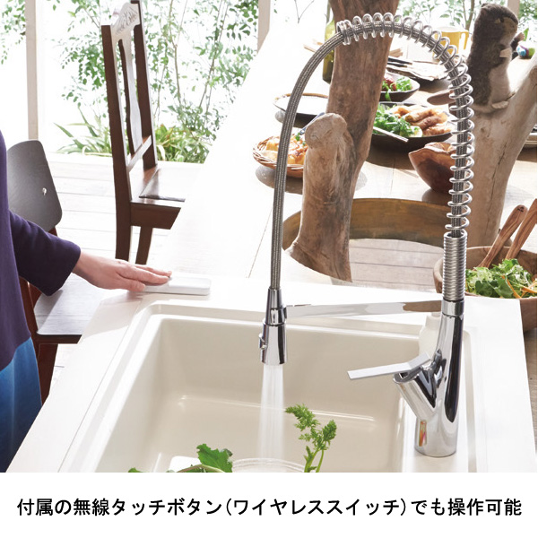 Google HomeやAmazon Echoの音声認識ユニットと、ワイヤレス式スイッチに対応したキッチン用水栓です。
