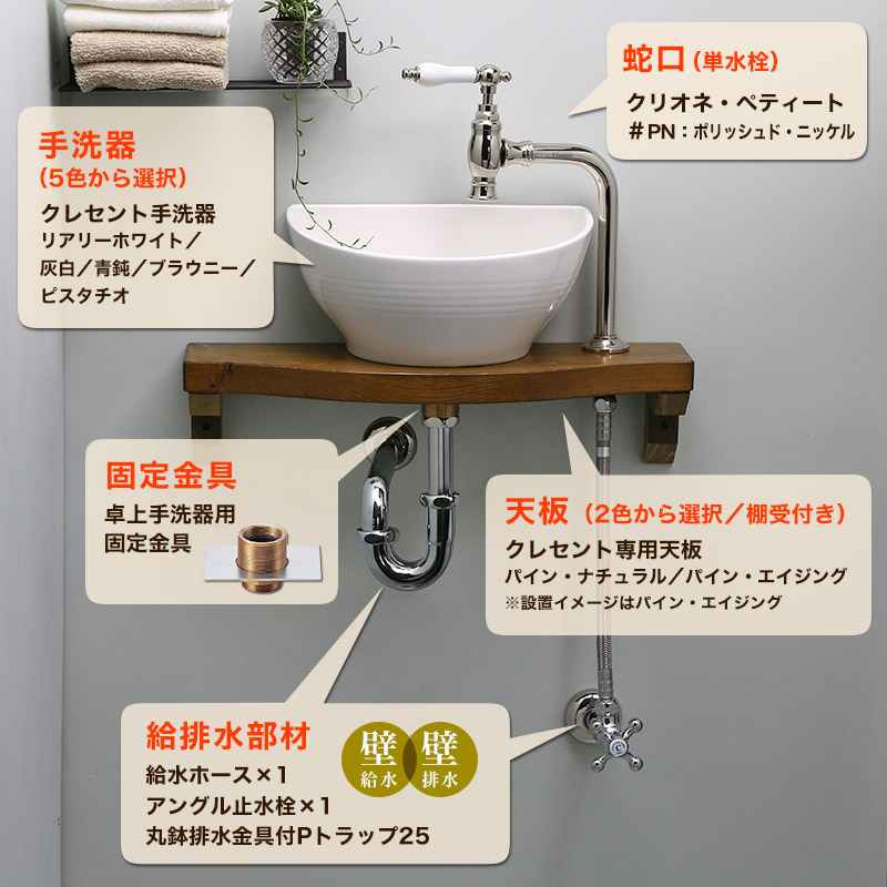 ミドルサイズの立水栓クリオネ・ペティートと、置き型ボウルの中でも個性的な半月型のフォルムで人気のクレセント手洗器との組み合わせは、デザイン的にも使い勝手も文句なしのベストコンビ!ボウルの色によって雰囲気や表情も変わるので、お気に入りの組み合わせをじっくり選んでくださいね。