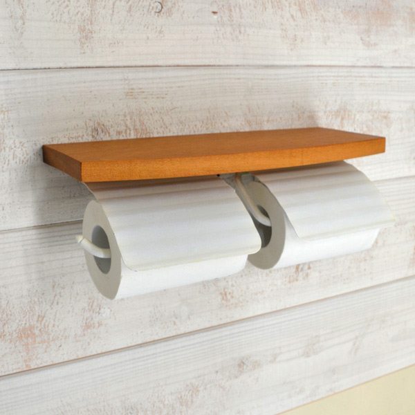 シェルフ付きの便利なトイレットペーパーホルダー。2連タイプなのでペーパーの補充も余裕をもって対応できます。ペーパーストッカーをかけるフックもあり、使いやすくデザイン性の高いアイテムです。