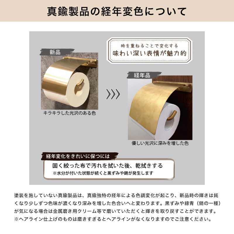| 色/表面仕上げ | PL:620710 金色/真鍮磨き仕上げ 年月とともに光沢に渋みが出て、真鍮独特の味わい深い色調に変化していきます。光沢がお好みの場合は、市販の研磨剤で磨いてください。 AN:620700 古色/真鍮古色仕上げ 無垢材の真鍮素材にアーティスティックな古色調の着色を行い、 わざと錆びたような独特な雰囲気を出しています。普段のお手入れはから拭き程度ですが、 汚れた場合は薄めた中性洗剤などで拭いてください。 WAB:620374 古白色/真鍮古白色仕上げ 無垢材の真鍮素材にアーティスティックな古白色調の着色を行い、わざと錆びたような独特な雰囲気を出しています。お手入れはから拭き程度です。 BK:620583 黒色/真鍮ブラック仕上げ 無垢材の真鍮素材をアンティーク風な艶消し黒色に塗装しました。お手入れは乾拭き程度で、汚れは薄めた中性洗剤などで拭き取ってください。 |