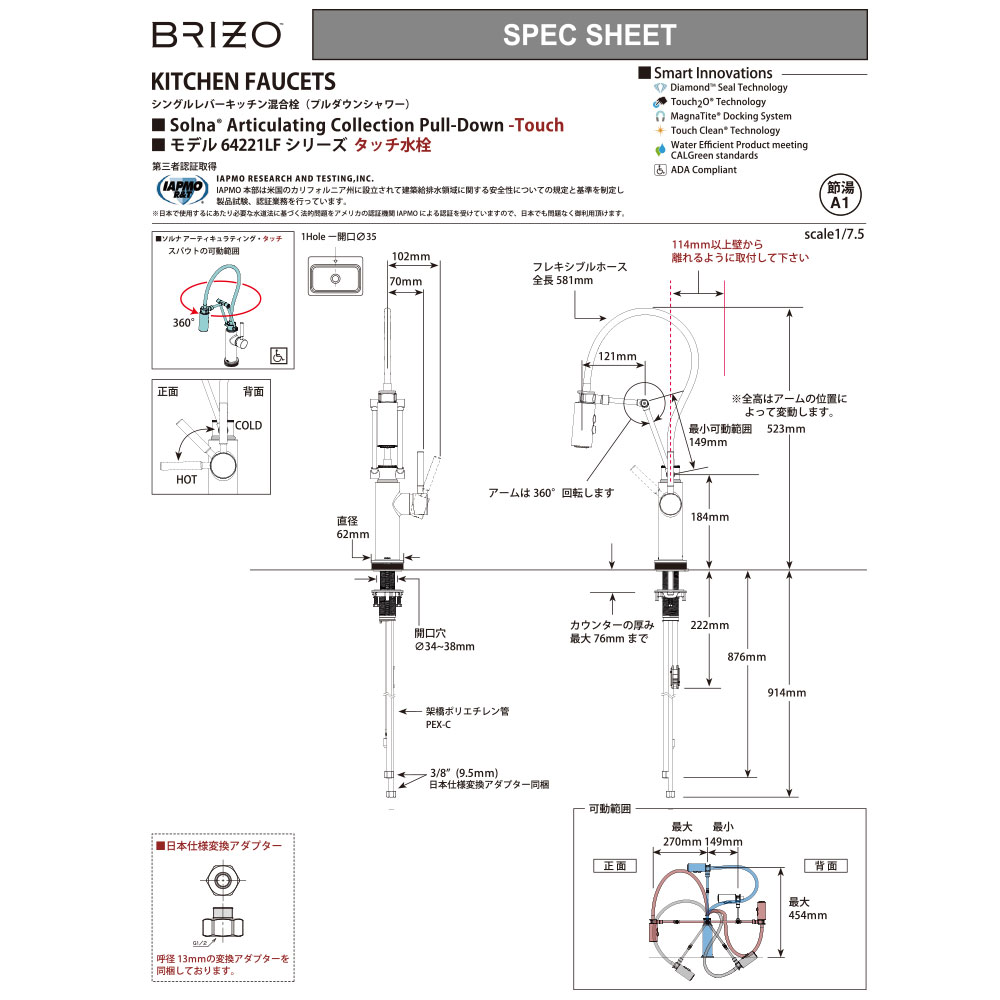| 給水規格 | G3/8 ※日本仕様(G1/2)に変換するアダプターが付属しています。 |