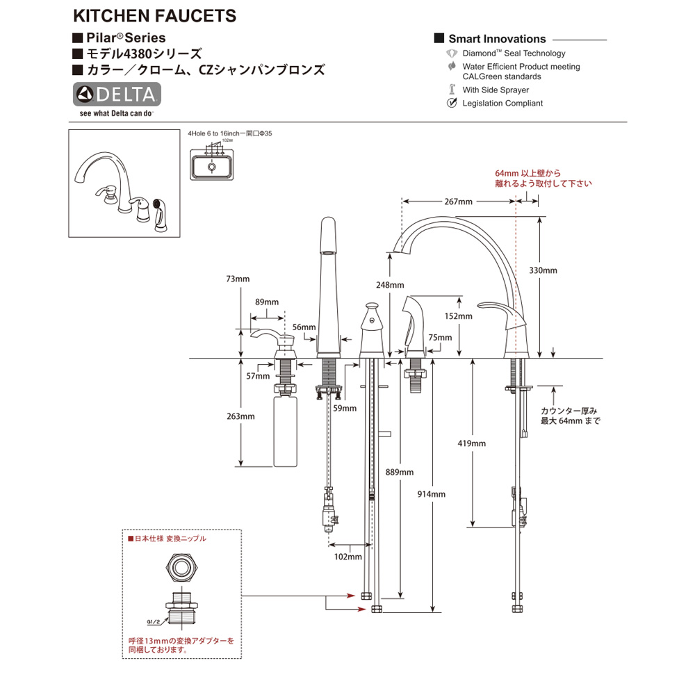 - 4ホールφ35ミリ(穴間隔101ミリ、 8インチセンタータイプ)のキッチンシンク、カウンターに対応。