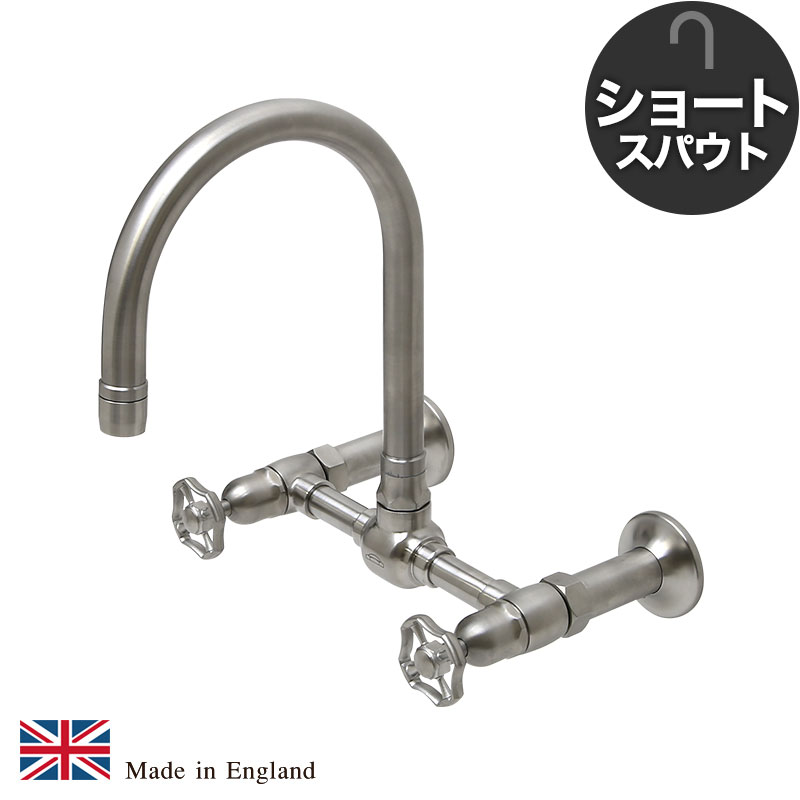 スワン型スパウトやステンレス・サテン仕上げが美しい2ハンドル水栓金具。
