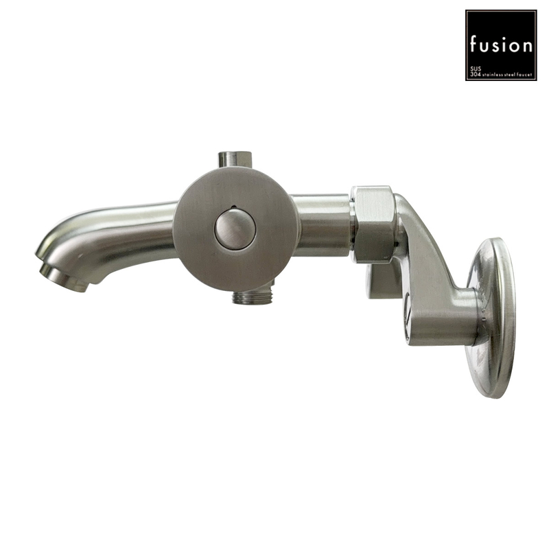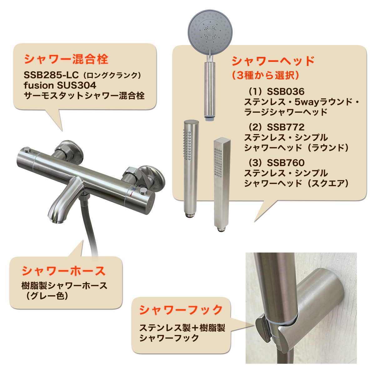fusion stainless faucet(フュージョン・ステンレス・フォーセット)が提唱する浴室用サーモスタットシャワー混合栓「SSB285-LC(ロングクランク)」に、シャワーヘッド・シャワーホース・フックがついた4点セットです。