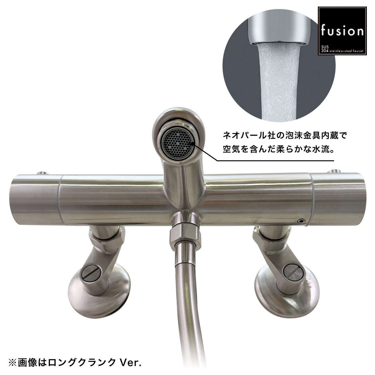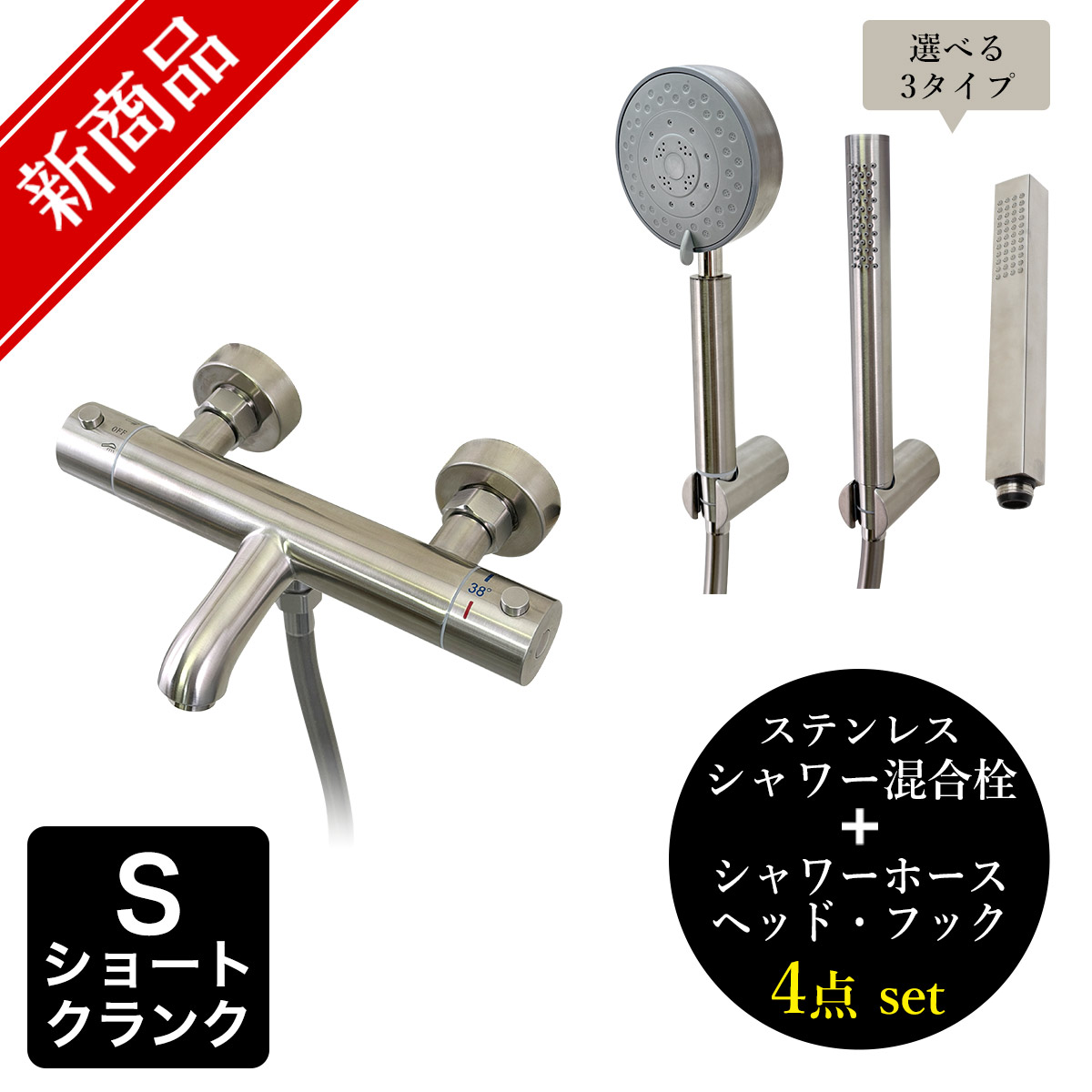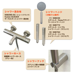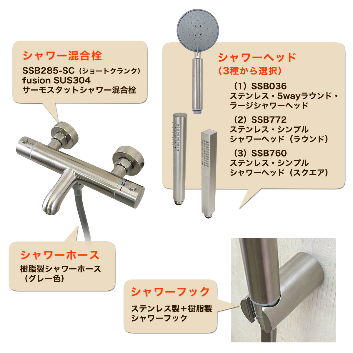 fusion stainless faucet(フュージョン・ステンレス・フォーセット)が提唱する浴室用サーモスタットシャワー混合栓「SSB285-SC(ショートクランク)」に、シャワーヘッド・シャワーホース・フックがついた4点セットです。