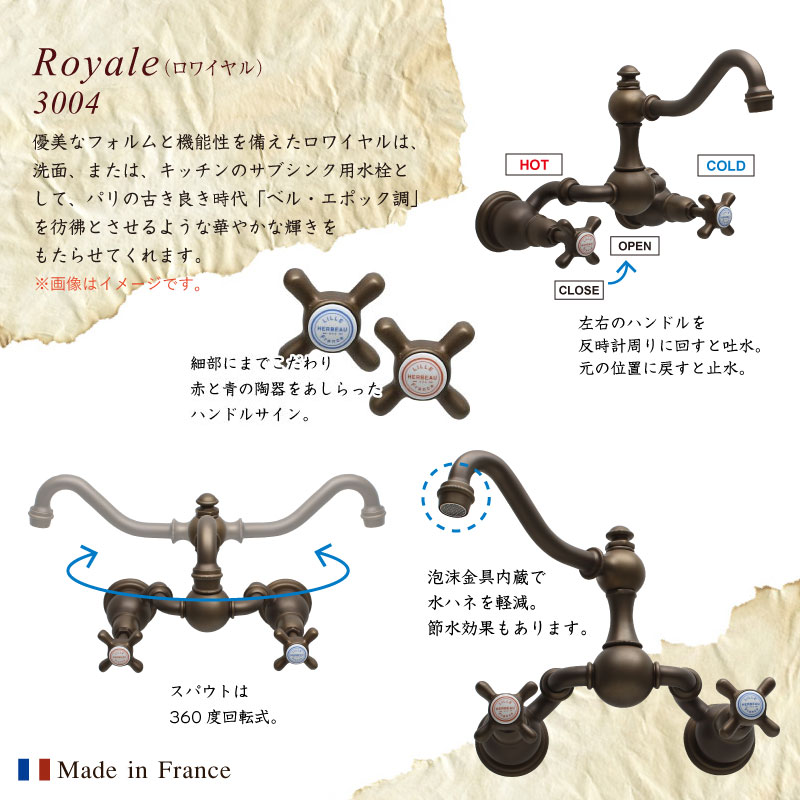 当社は国内唯一の Herbeau社水栓金具の総代理店としてフランス本社から直輸入販売を行っています。日本の水道環境に合わせたカスタムメイドを行っておりますので、日本国内で問題なく設置・ご使用いただけます。