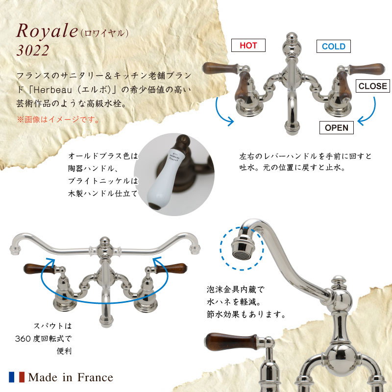 当社は国内唯一の Herbeau社水栓金具の総代理店としてフランス本社から直輸入販売を行っています。日本の水道環境に合わせたカスタムメイドを行っておりますので、日本国内で問題なく設置・ご使用いただけます。