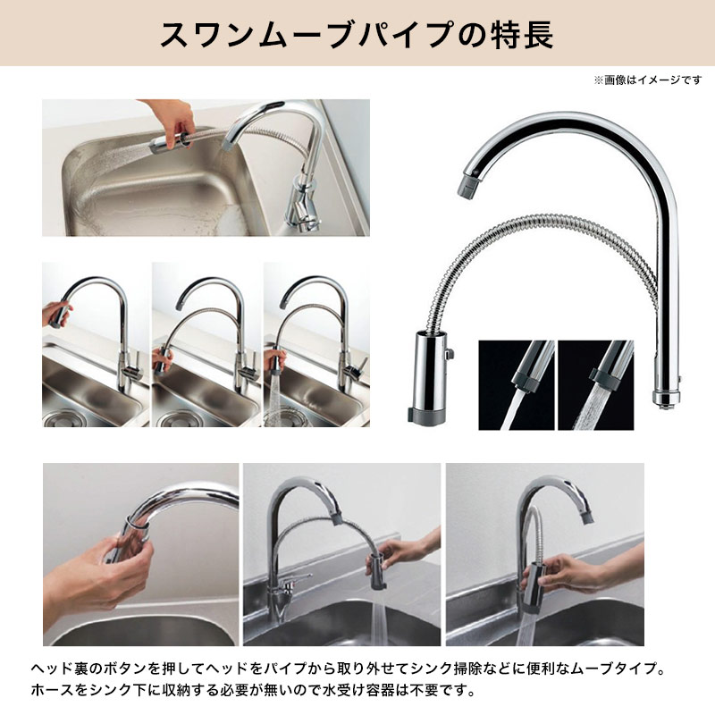 小型スワンムーブ仕様のスパウトで、簡単に取り外せて自由に動かせます。洗面台やキッチンシンクのお手入れ、大きいお鍋に水を溜めるときなど便利に使えます。スロップシンクや多目的シンク、大型の洗面ボウルと組合わせがおすすめです。