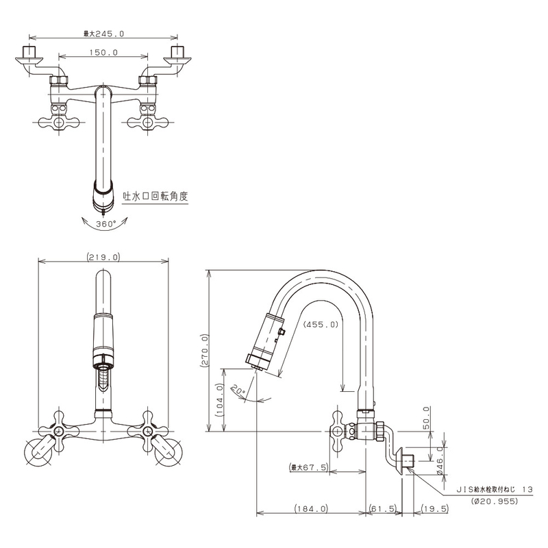 | 用途・種別 | キッチン・洗面用/壁付2ハンドル混合水栓 |