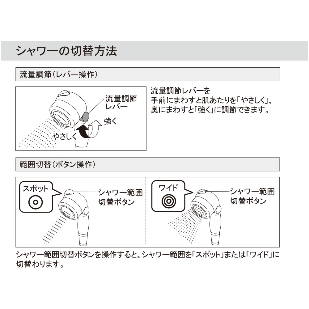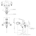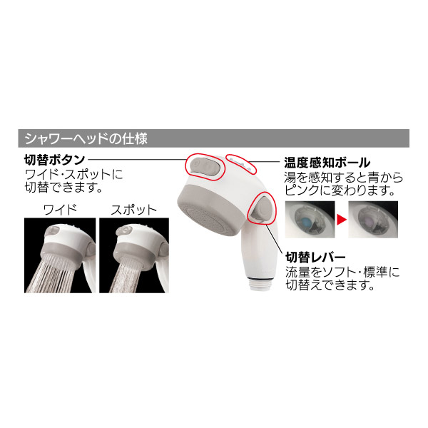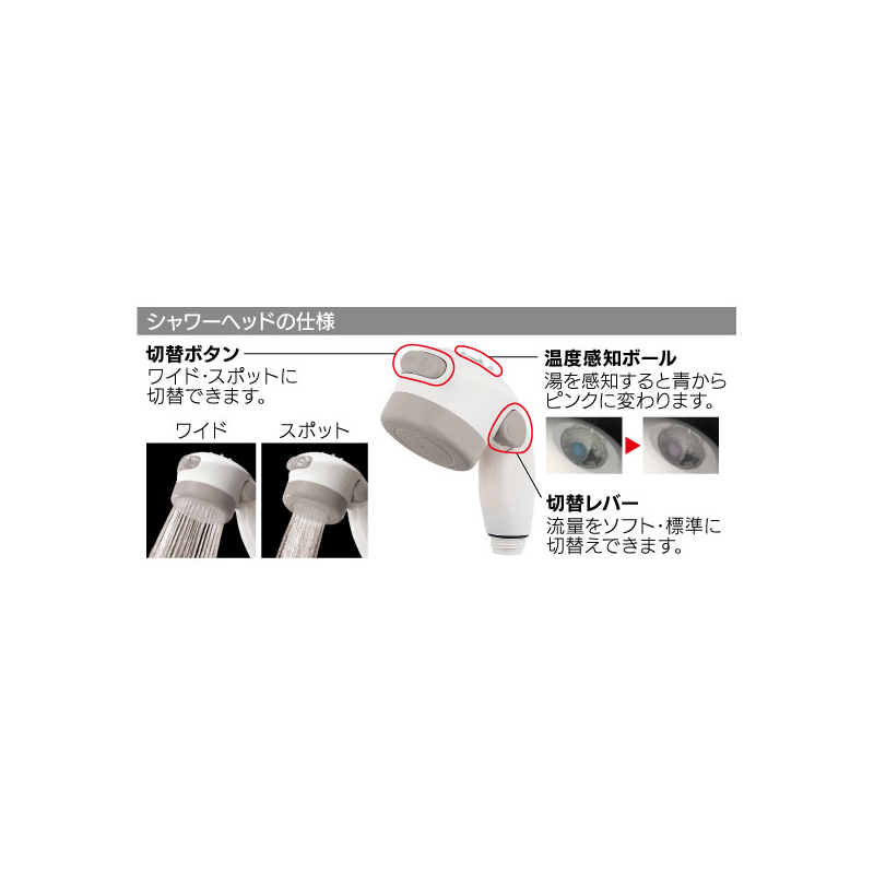 | 吐水部 | ヘッド取外し式(ホース長:500mm) ※水流切替:ワイド・スポット、流量調節機能付き |