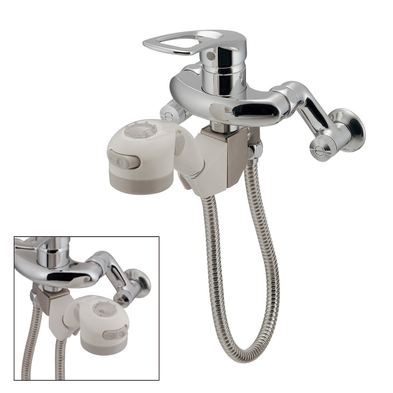 洗髪やペットのお風呂、洗濯物の予洗いなど、多目的に使えるシャワー付きの壁出し水栓。シャワーヘッドには流量調節レバーとシャワー範囲を切り替えるボタンがついており、用途に合わせて使い分けることができます。また温度感知ボールが内蔵されており、お湯を感知すると青からピンクに色がかわります。