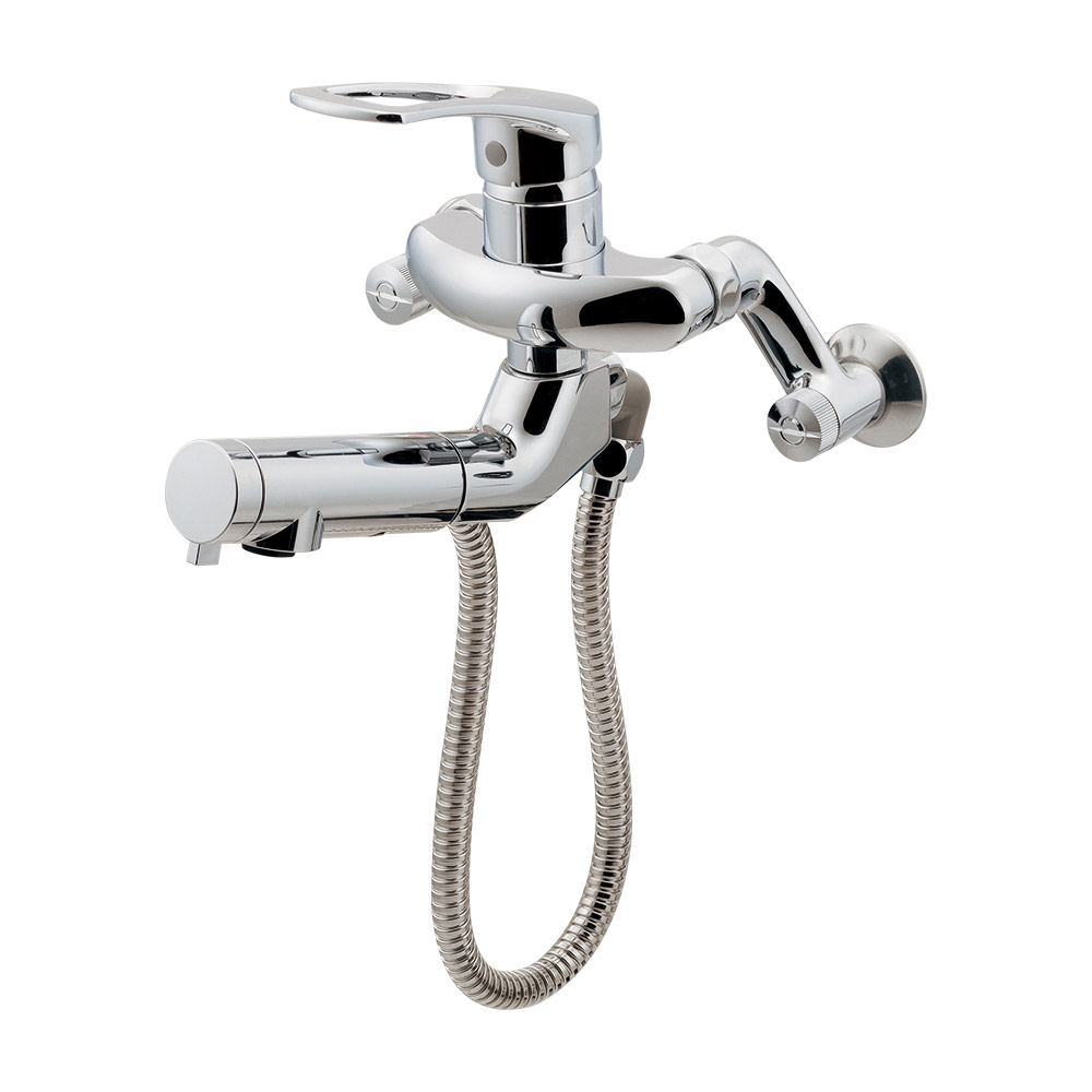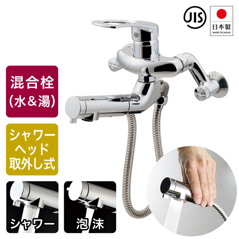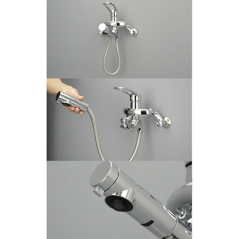 洗髪やペットのお風呂、洗濯物の予洗いなど、多目的に使えるシャワー付きの壁出し水栓。シャワーと泡沫吐水の水流切替ができます。用途に合わせて使い分けることができます。