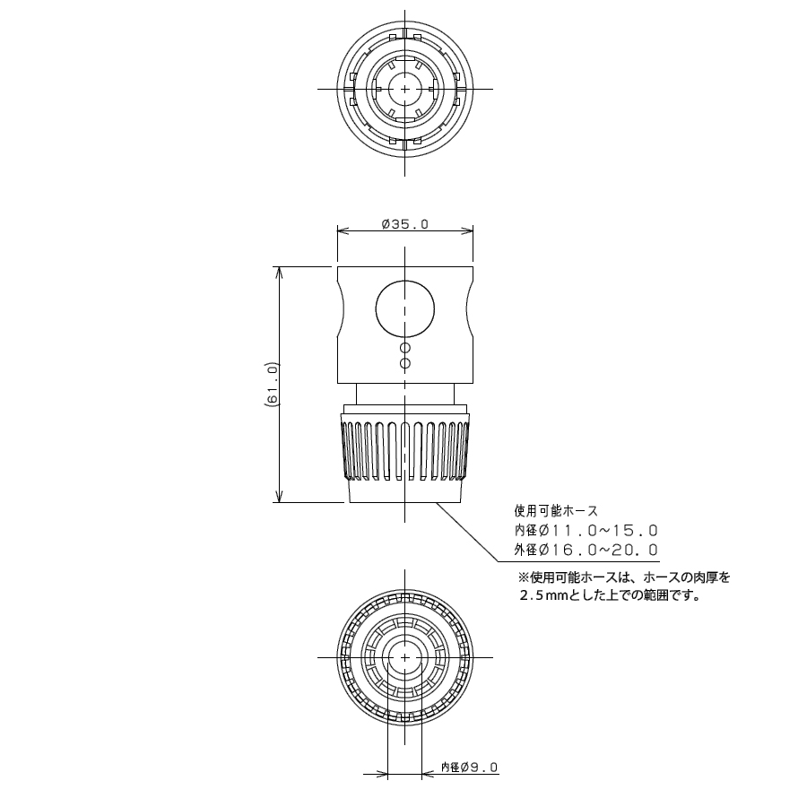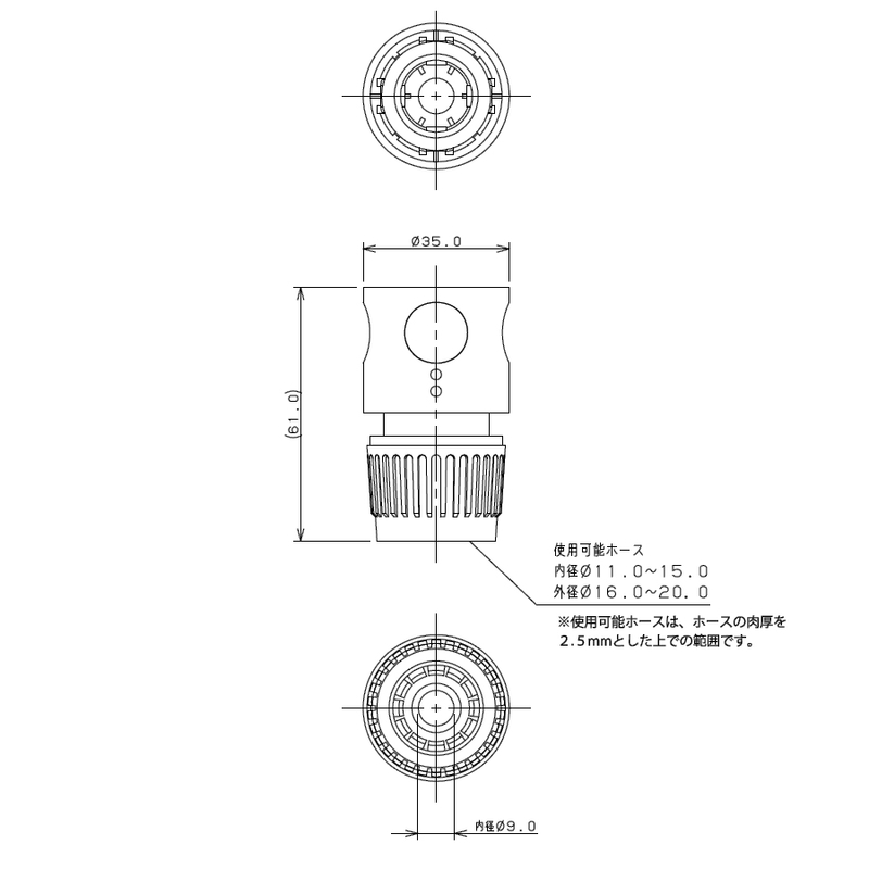 - 適用ホース:内径11〜15ミリ、外径16〜20ミリのホース(ホースの肉厚2.5mmとした場合)