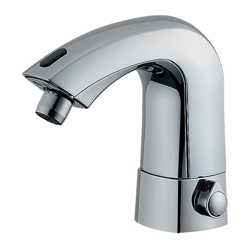 センサー部に手をかざすと水が出て、離れると止まるセンサー式の混合水栓です。