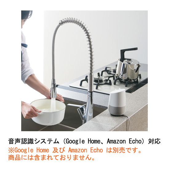 Google HomeやAmazon Echoの音声認識ユニットと、ワイヤレス式スイッチに対応したキッチン用水栓です。