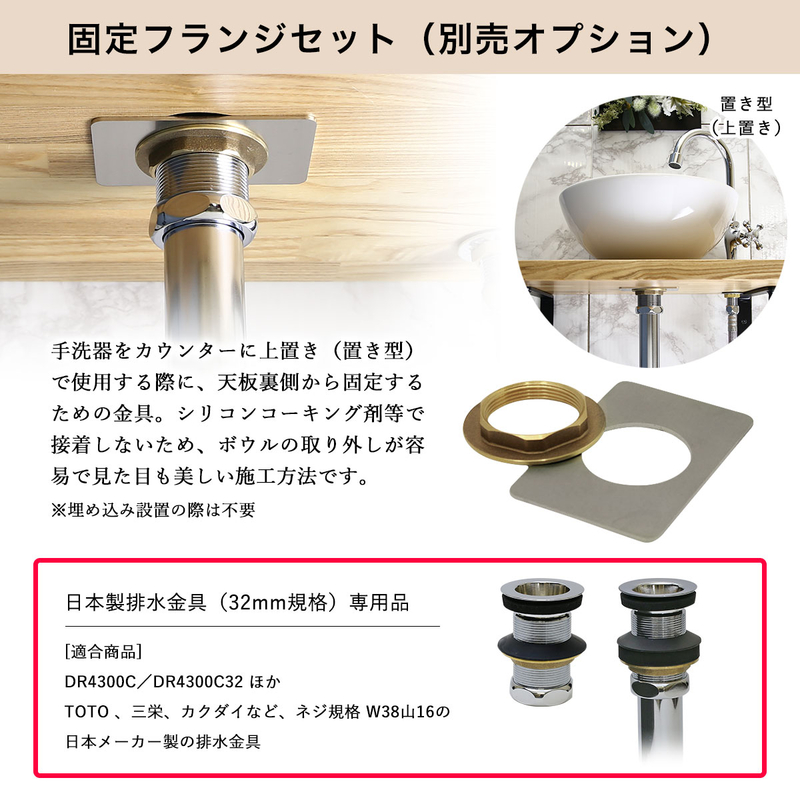 この排水金具は主にオーバーフローの無いホワイティボウル、輸入ガラスボウル、輸入洗面器などと組合わせてご使用下さい。