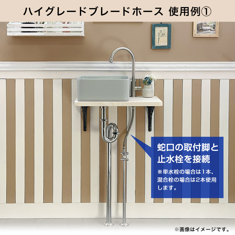 - 蛇口の取付け足と止水栓を接続する給水ホースとして使用されます。