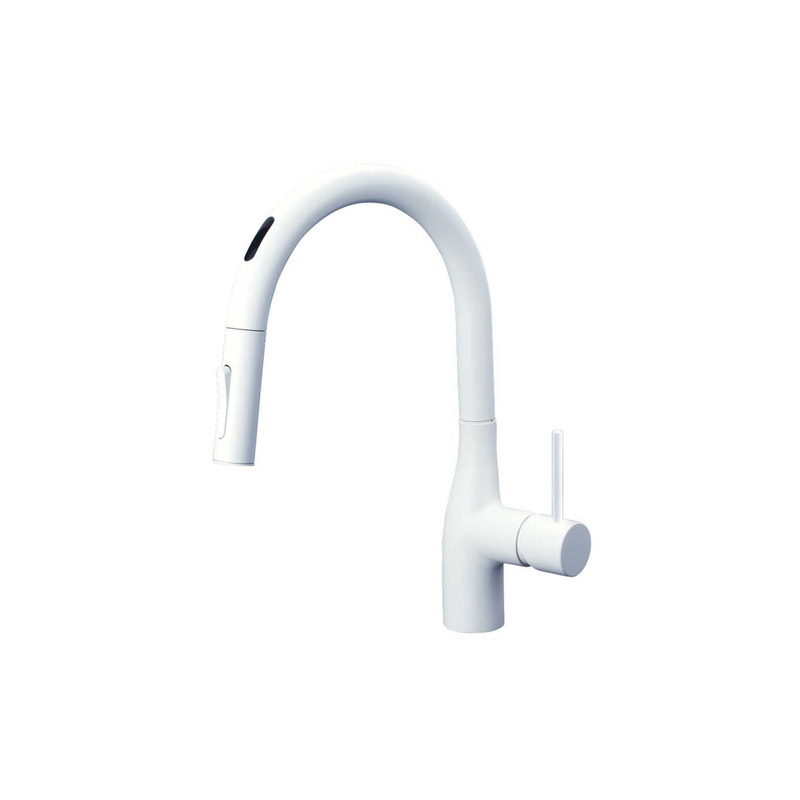 吐水口(吐水ヘッド)が引き出せるお洒落で便利な白いキッチン用蛇口です。