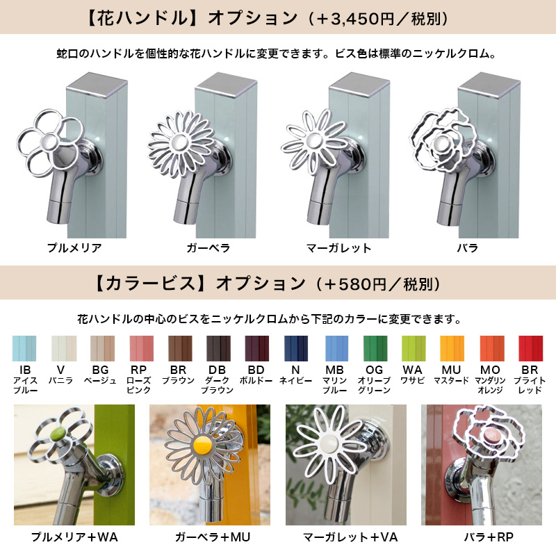 蛇口のハンドルをオプションで花型ハンドルに変更できます(上部蛇口・補助蛇口いずれも変更可)。カラービスは花ハンドルを選んだ場合の追加オプションです。水栓柱と違う色を選んでも個性的でおしゃれ!