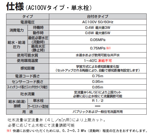| 用途・種別 | 洗面・手洗い用/台付き単水栓(水のみ) |