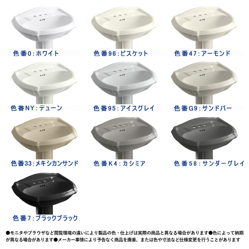 | セット内容 | ペデスタル洗面器本体(取付用部品付属) ※水栓金具・排水金具等は付属していません |