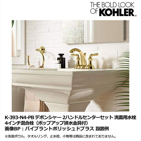 水栓直付けタイプの洗面ボウルにおすすめの2ハンドル(4インチ用)洗面所用水栓です。同社のポップアップドレン排水金具も付属しています。