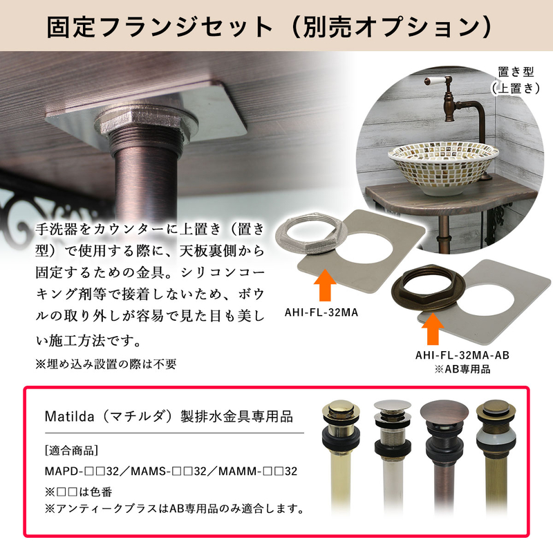 この排水金具は主にオーバーフローの無い手洗鉢(国内製・海外製不問)、輸入ガラスボウル、輸入洗面器などと組合わせて使用します。