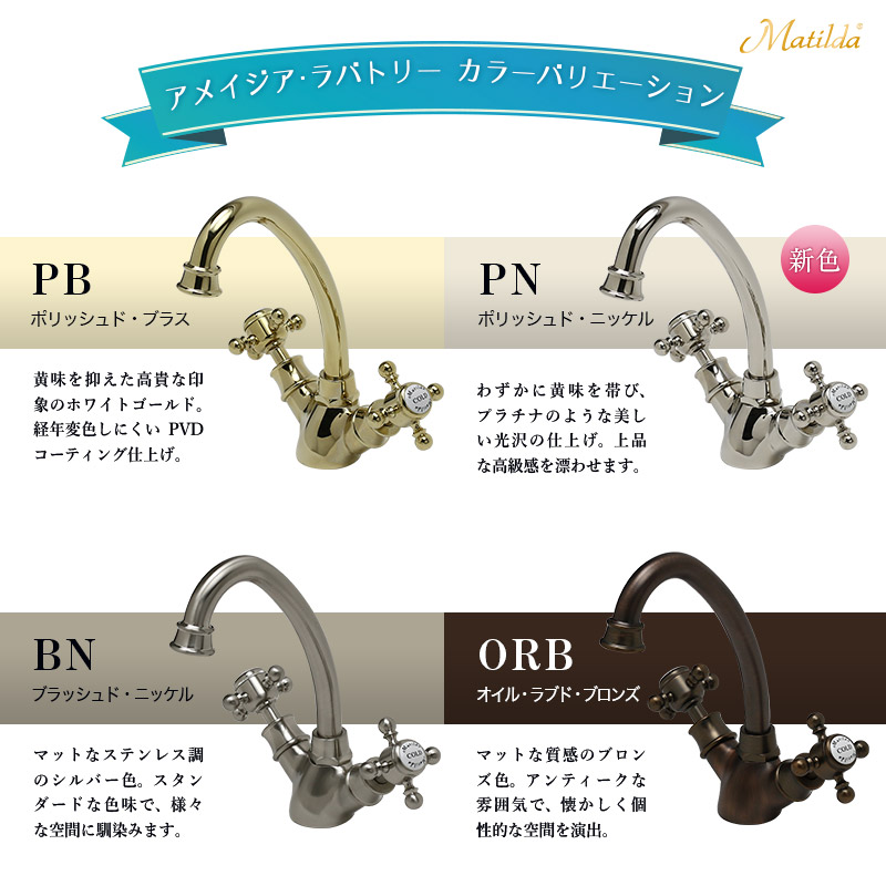 表面仕上げは、マチルダ水栓ニューカラーの「ポリッシュド・ニッケル」。従来の「ブラッシュド・ニッケル」に比べて光沢のあるプラチナのような輝きが特徴です。