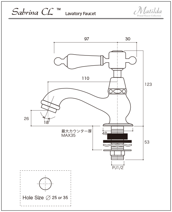 サブリナ単水栓に付属のφ35mm用パッキンの使用により混合栓用の洗面器やカウンターにしっかりと固定できます。単水栓用の穴径φ25mmの場合は、φ35mm用パッキンは使用しません。詳しくは左の画像をご覧ください。