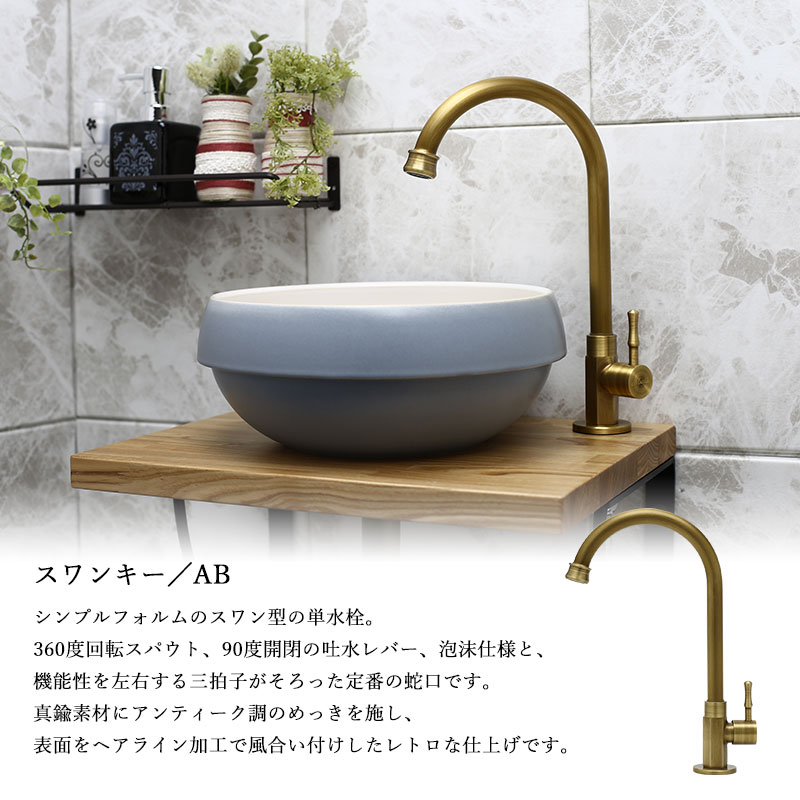 シンプルフォルムのスワン型の単水栓。360度回転のスパウト、吐水先端には泡沫金具、90度開閉のクォーターハンドルと、使い勝手は申し分ありません。 単水栓としては大き目に設計されていますので、中型以上の洗面ボウルやシンクと組合わせてのご使用がおすすめ。