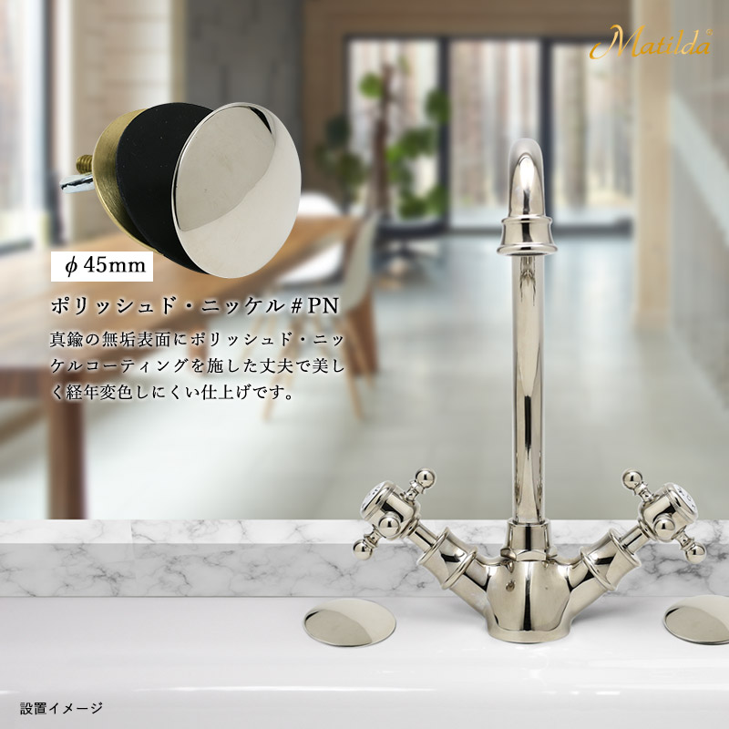 わずかに黄味を帯び、プラチナのような美しい光沢は上品な高級感をもたらす「ポリッシュド・ニッケル」の表面は、真鍮の無垢表面にポリッシュドニッケルめっきを施した変色しにくく耐久性に優れた仕上げです。尚、この表面処理は比較的強靭でキズも目立ちませんが、金タワシや磨き粉などのご使用はお控えください。