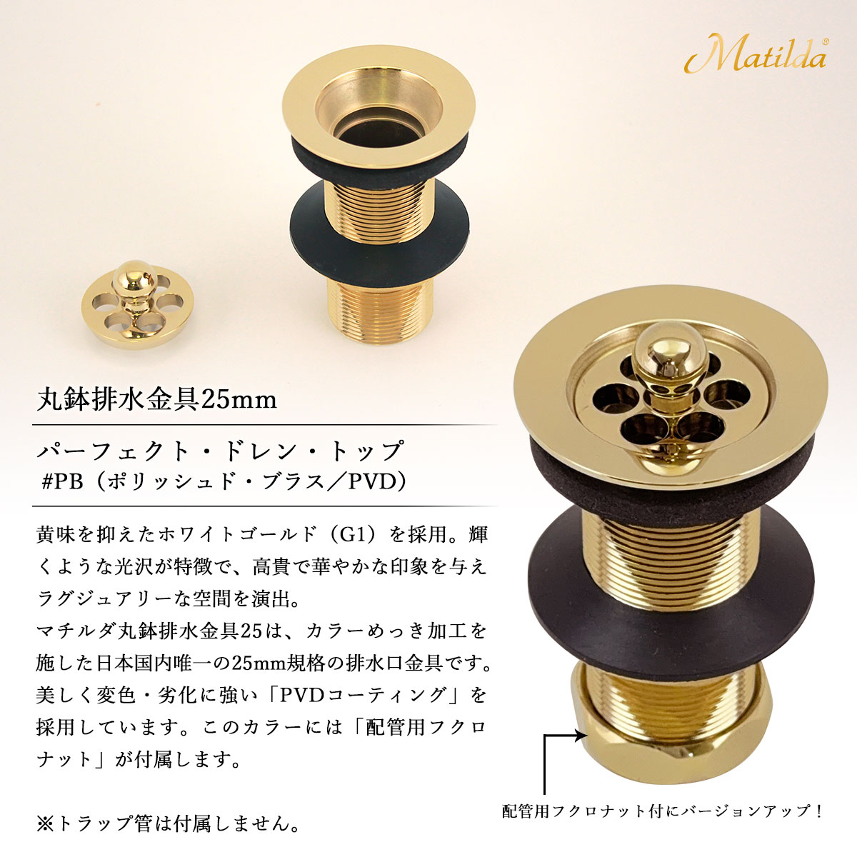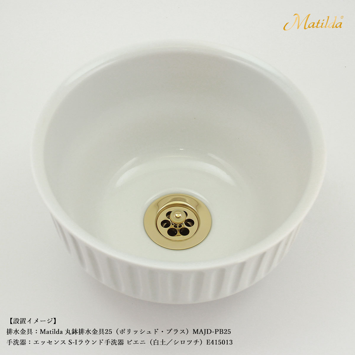 本製品『Matilda 新・丸鉢排水金具25』は、お客様のお気に入りの手洗器を長期間、美しく強固に支え続けることを目指した、こだわり抜いた「パーフェクト」な排水金具です。