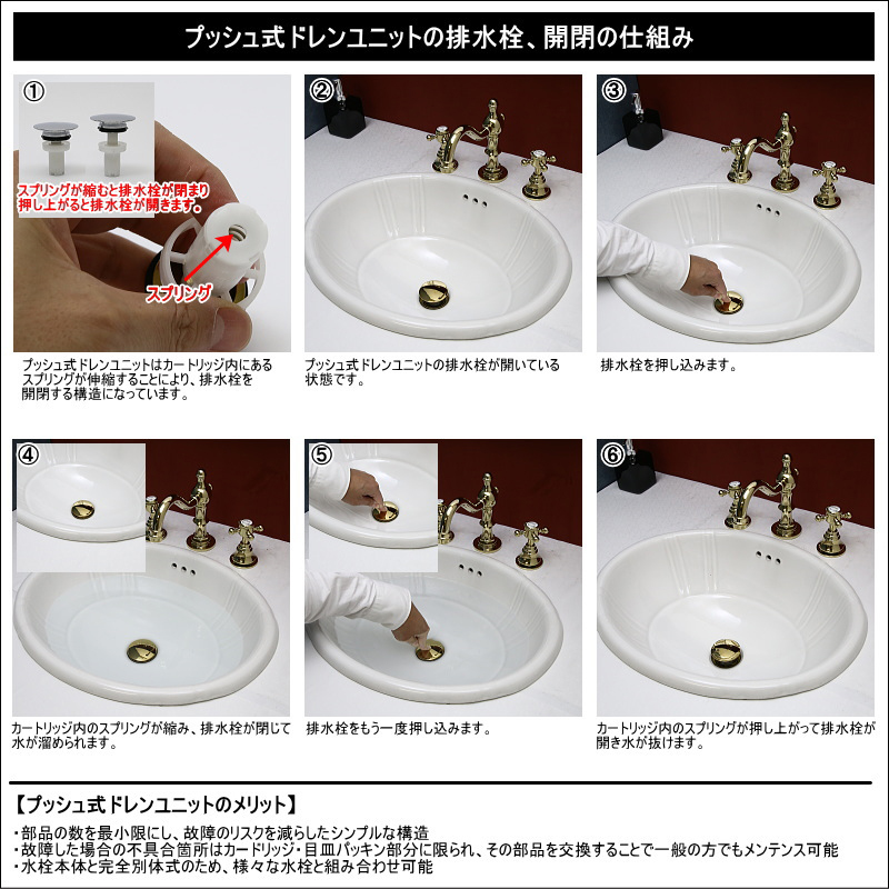 • 排水口を掃除したいときは中心部分を反時計回りに回すと、内部の『 プッシュ・カートリッジ 』が取り出せ、簡単にお掃除が出来ます。