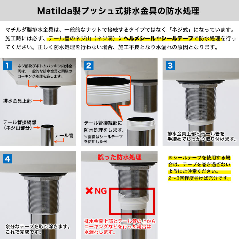 上部パッキンに「高性能ネオスポンジ」を採用することにより洗面器とのフィット感を増し水漏れ等のトラブルを回避します。下部パッキンには、「極厚10ミリパッキン」を追加装備する事により様々な厚みの洗面器に対応可能です。例えば、肉厚が薄過ぎて通常の排水金具が取り付けできない等の場合に効果を発揮します。