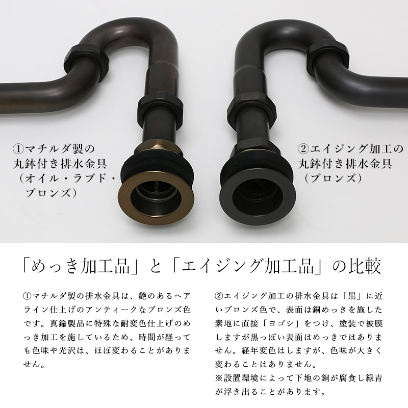 【丸鉢排水口金具部分】オイル・ラブド・ブロンズ(ORB)耐変色めっき 真鍮素材にオイルステイン調のブロンズめっきを施した経年変色しにくい仕上げです。表面をヘアライン加工で風合い付けしたアンティークな味わいがあります。 【配管部分】真鍮ブロンズ仕上げ 年月を重ねるとさらに黒く深みのある色に経年変色します。 |
