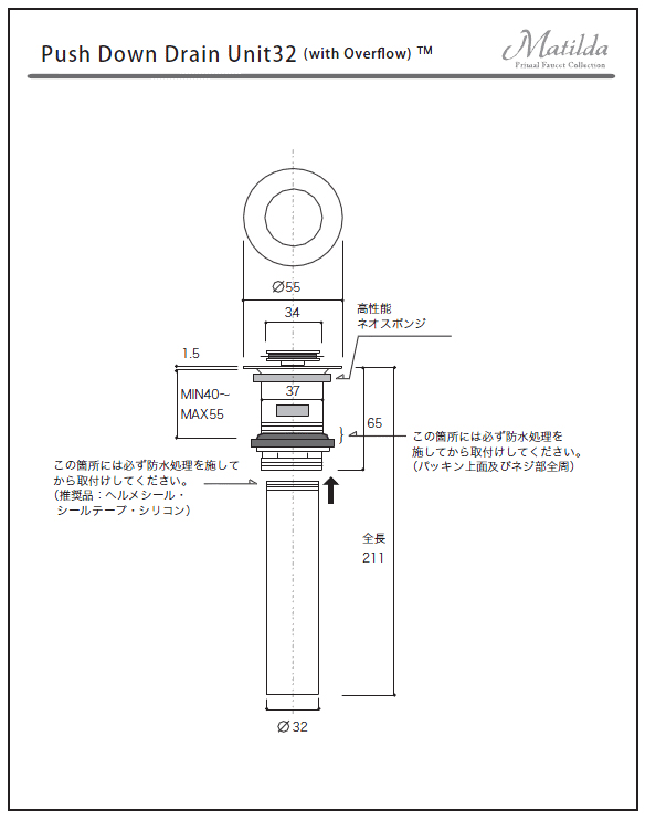 水栓と同色の上部排水金具が付属します。組合わせる洗面ボールのオーバーフローの有無に合わせてお選びください。