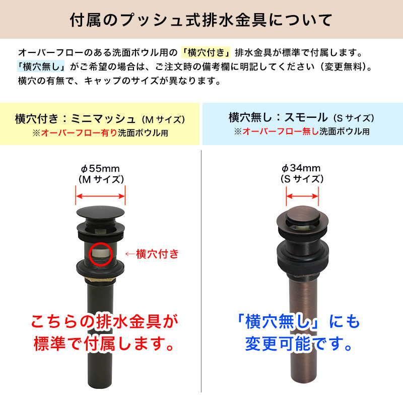 洗面ボウルや手洗器には「オーバーフロー」と呼ばれる水を逃がす穴があるものと無いものがあります。洗面ボウルのオーバーフローの有無や排水穴の大きさによって、使用する排水金具が異なります。詳しくは下記リンクよりご参照ください。