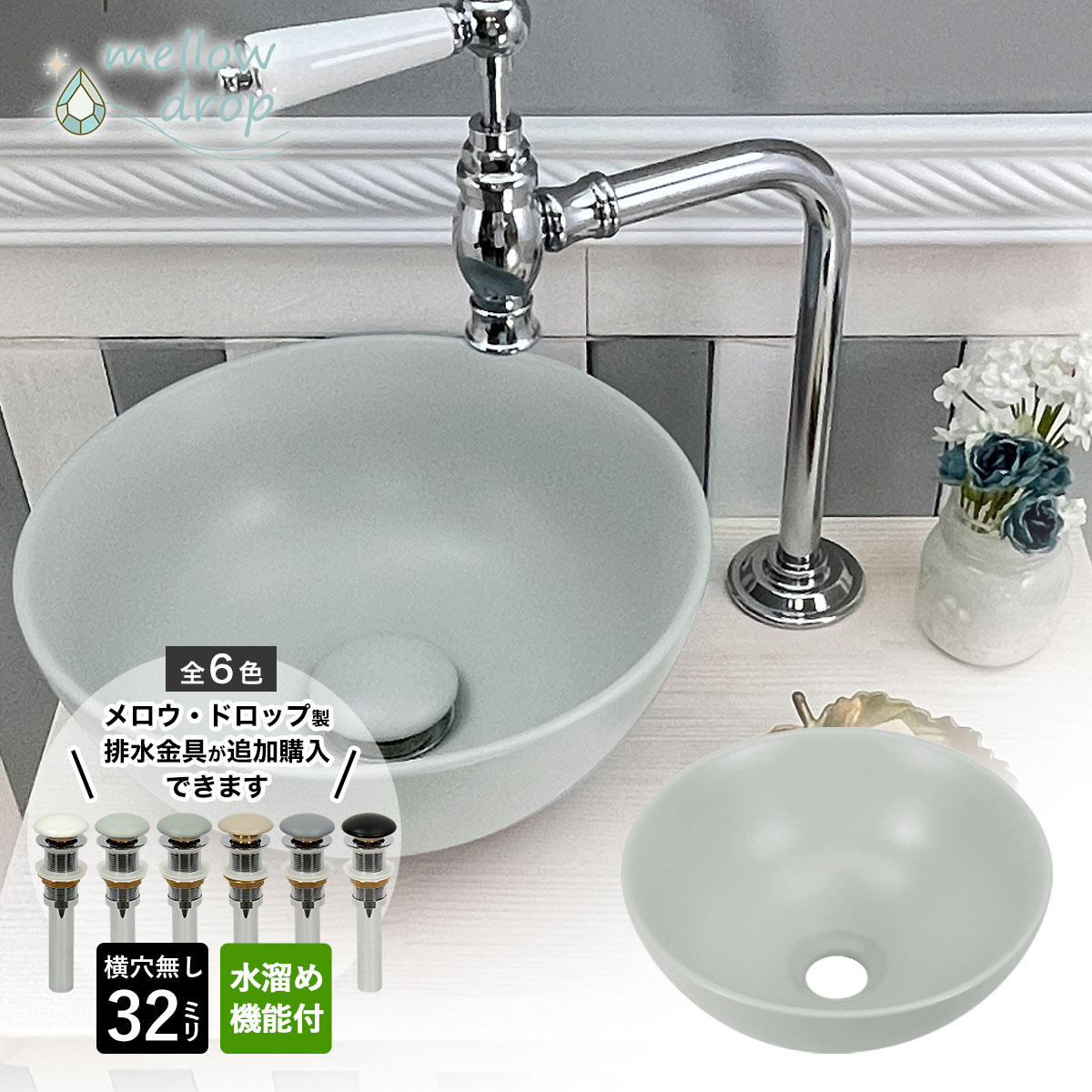 mellow drop/メロウ・ドロップは、彩度を抑えたくすみカラーやアッシュ、グレイッシュな色合いの洗面ボウルと排水金具のブランドです。上品でまろやかなカラーのボウルは人気の北欧テイストのお家づくりや、時代に流されないナチュラルモダンスタイル、ほんのり和テイストなシーンなど、様々な空間に馴染みます。