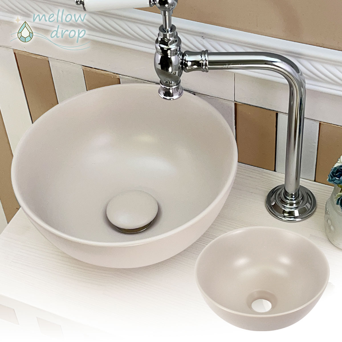 mellow drop/メロウ・ドロップは、彩度を抑えたくすみカラーやアッシュ、グレイッシュな色合いの洗面ボウルと排水金具のブランドです。上品でまろやかなカラーのボウルは人気の北欧テイストのお家づくりや、時代に流されないナチュラルモダンスタイル、ほんのり和テイストなシーンなど、様々な空間に馴染みます。
