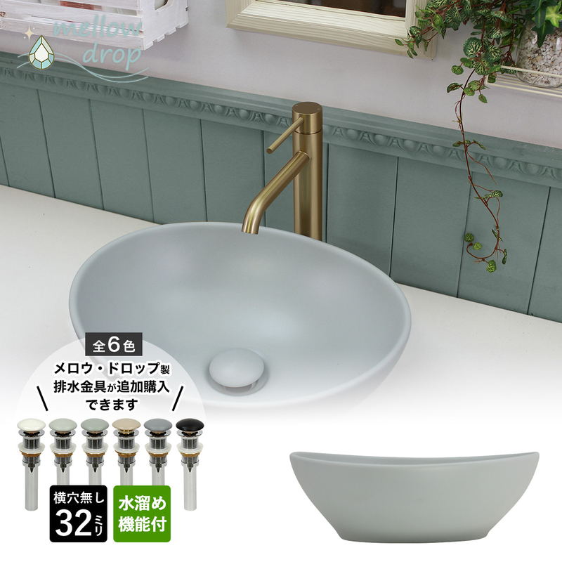 mellow drop/メロウ・ドロップは、彩度を抑えたくすみカラーやアッシュ、グレイッシュな色合いの洗面ボウルと排水金具のブランドです。上品でまろやかなカラーのボウルは人気の北欧テイストのお家づくりや、時代に流されないナチュラルモダンスタイル、ほんのり和テイストなシーンなど、様々な空間に馴染みます。