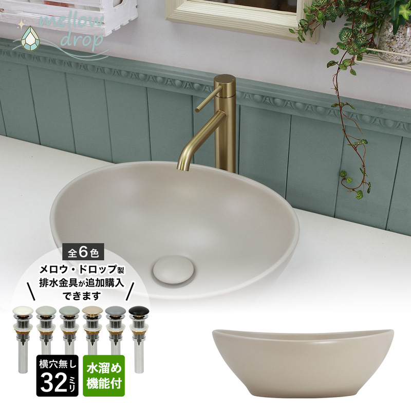 mellow drop/メロウ・ドロップは、彩度を抑えたくすみカラーやアッシュ、グレイッシュな色合いの洗面ボウルと排水金具のブランドです。上品でまろやかなカラーのボウルは人気の北欧テイストのお家づくりや、時代に流されないナチュラルモダンスタイル、ほんのり和テイストなシーンなど、様々な空間に馴染みます。
