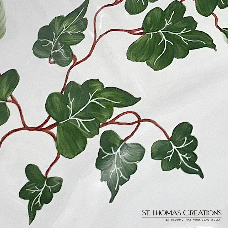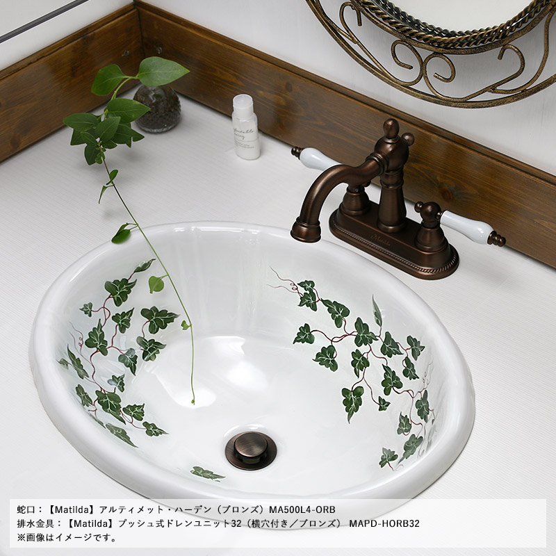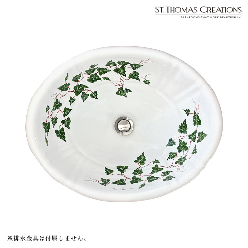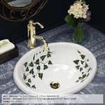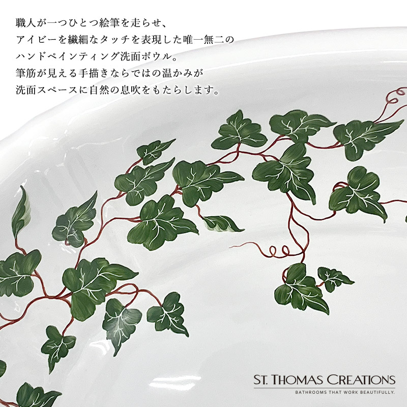絵入れした後、約900度の窯で焼き入れしていますので剥げ落ちることはありません。セントトーマス特有の主張しすぎない上品な絵柄をお楽しみください。尚、ベースの洗面ボールは「アンティガ・グランデ」です。