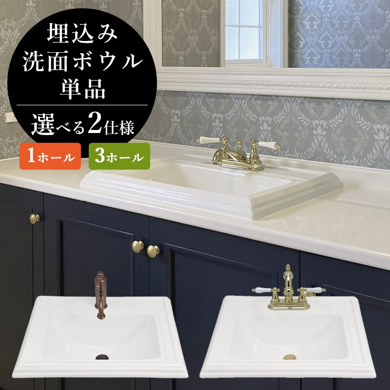 水栓直付けタイプの埋込型スクエア洗面ボウル