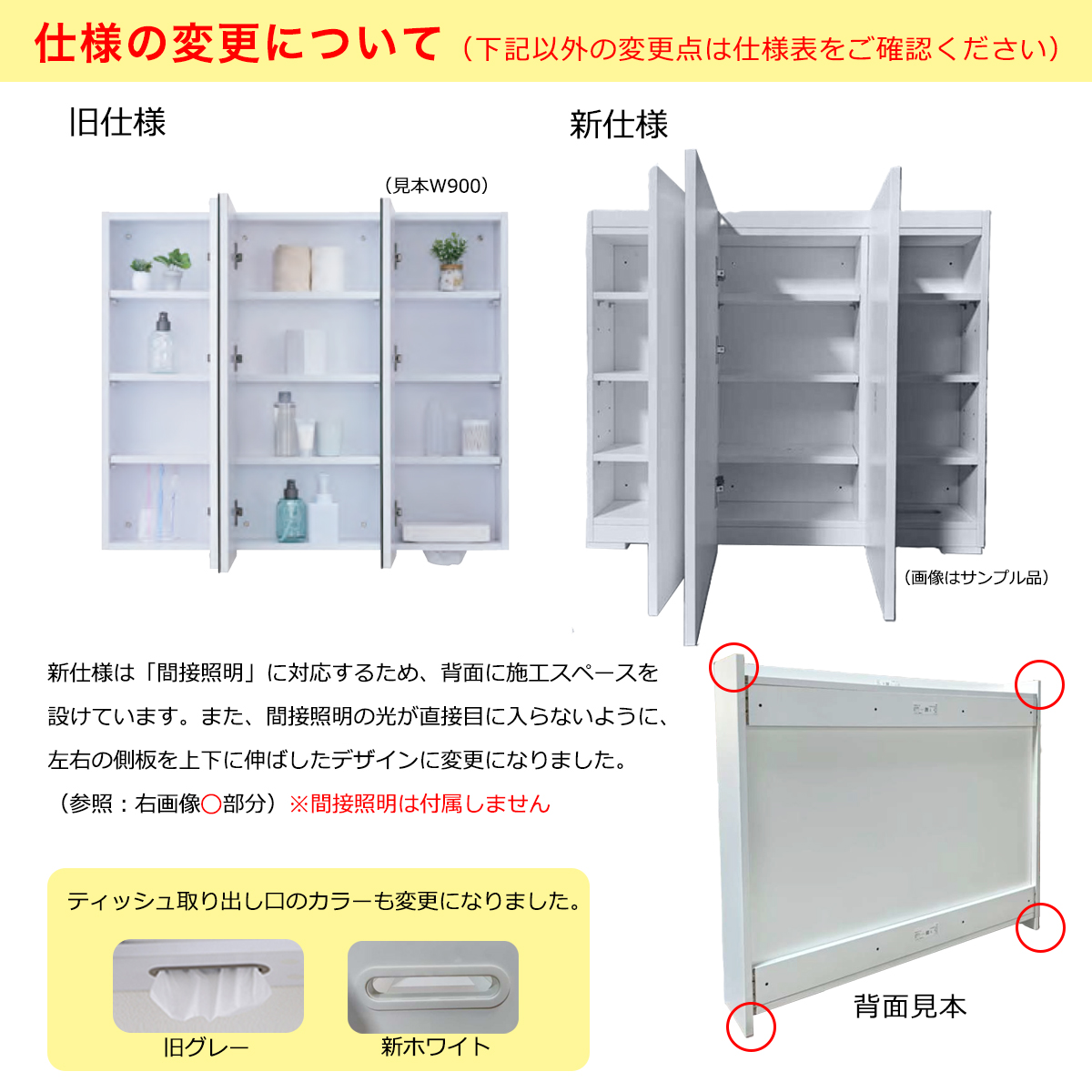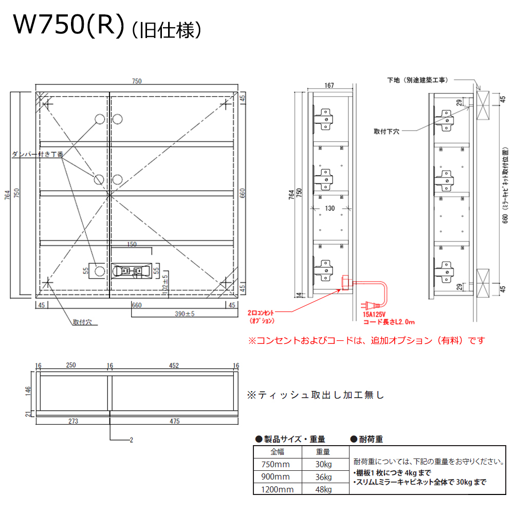 - 750mmの右側が広いタイプ(WB750RSL)にはティッシュ取り出し口がありません。