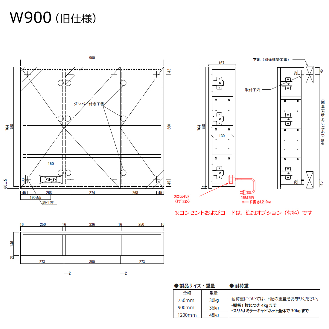 - WB900SL:W900×D167×H750 mm(重量:36kg)