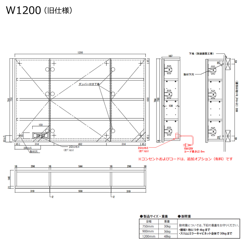 - WB1200SL:W1200×D167×H750 mm(重量:37.7kg)