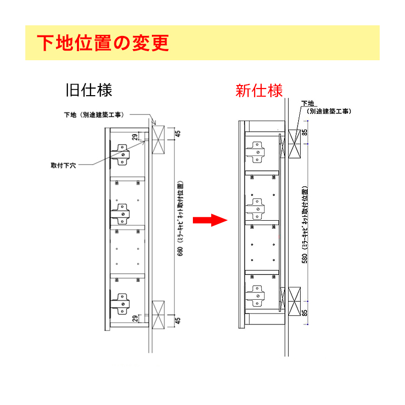 下地位置の変更(画像)及び、下部の仕様表をよくご確認ください。