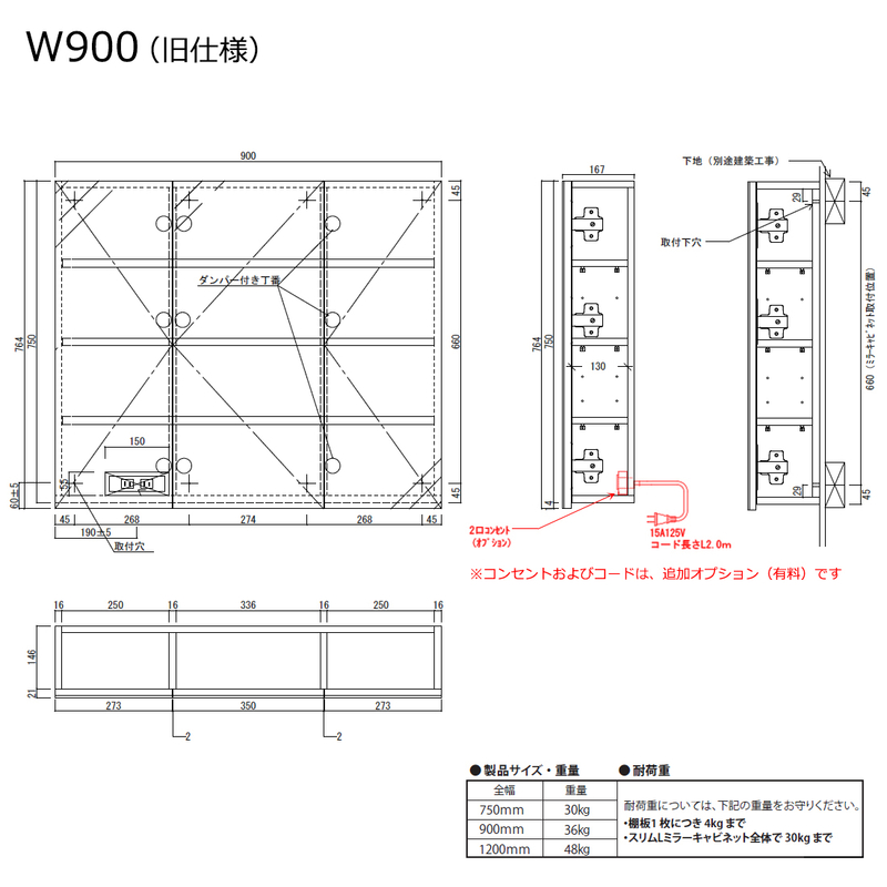 - WB900SL:W900×D167×H750 mm(重量:31.5kg)