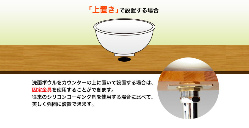 シリコンコーキング材等の施工は、強固に固定することができる反面、洗面器や手洗い器の交換の際、取り外すのに非常に手間がかかったり、ガラスボウル等にコーキングを行うと、施工面が見えてしまって仕上がりに不満が残ったりといった事があります。
