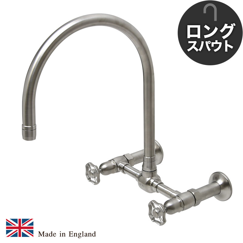 スワン型スパウトやステンレス・サテン仕上げが美しい2ハンドル水栓金具。